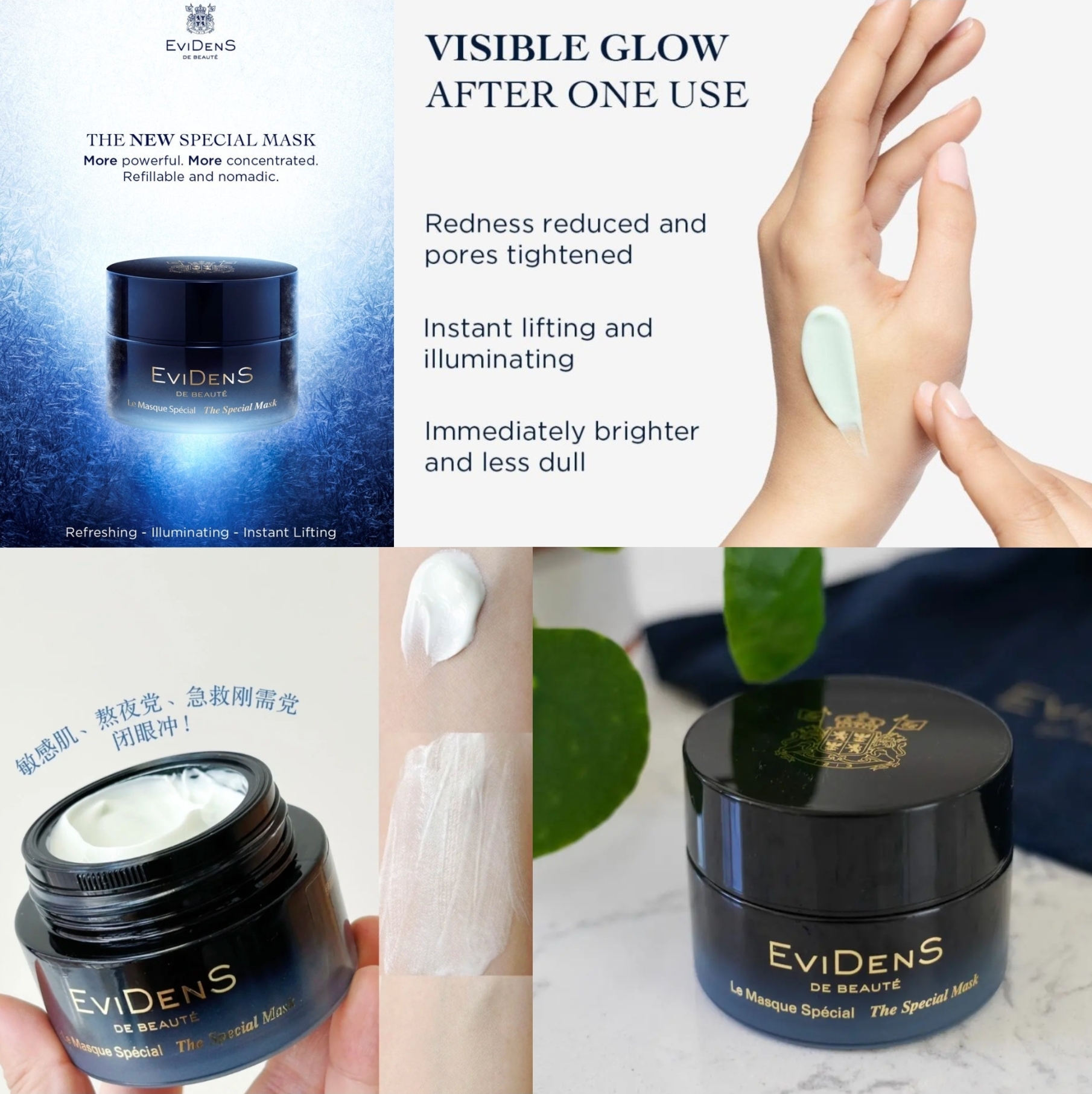-多效煥膚面膜憑藉著成分豐富的配方和可再填充包裝能有效喚醒暗啞肌膚,為肌膚帶來健康光澤,展現肌膚的自然美。使用多效煥膚面膜後,肌膚立即獲得提拉、綻放嶄新光彩。多效煥膚面膜的清涼帶來毛孔收縮的驚人效果,並為肌膚提供持久的清爽感。