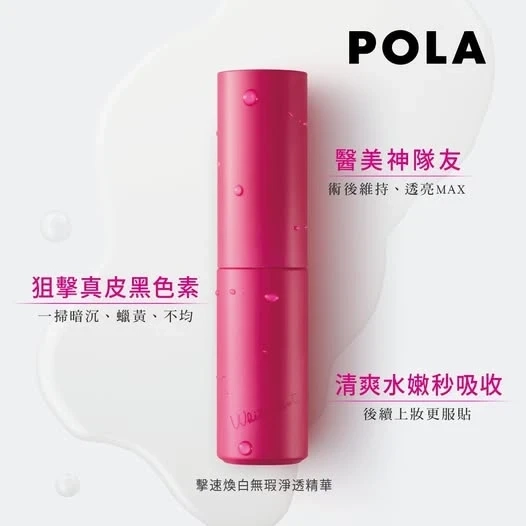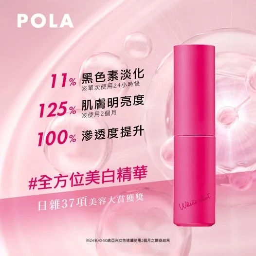 -POLA 嶄新發現,掉進真皮層的黑色素是頑固色斑及暗沉的成因。全新 WHITE SHOT 炫白淨透精華液蘊含3 種美白活性成份和 7 種 POLA 獨有保濕成份,包括: 全新成份「MP 淨透液」有效提升真皮層的潔淨細胞—「巨噬細胞」瓦解黑色素的能力;Deep Luster 消除血管暗沉;維他命C誘導體減淡黑色素及醫藥部外品認可的最強美白有效成份「魯米諾」高效抑制黑色素產生。
