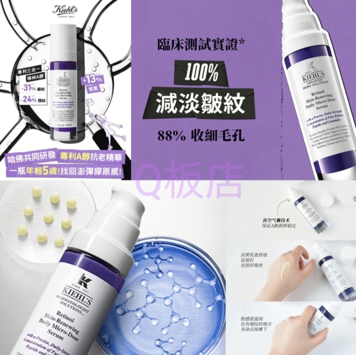 想急救皮膚及預防衰老👱🏼♀️?Kiehl’s 醫學淡紋緊緻再生精華係不二之選👊,主要成分是純正A醇 Pure Retinol,能加速細胞再生及促進膠原蛋白新生,同時改善皺紋細紋、毛孔及粗糙膚質,令肌膚更緊緻及飽滿🔝。