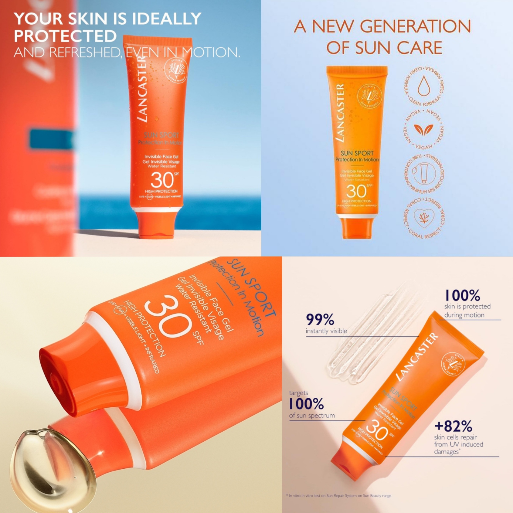 Lancaster Sun Sport Invisible Face Gel SPF30是一款專為運動和戶外活動設計的透明臉部防曬凝膠,主打無重感、不油膩、不黏膩,即使在濕潤或乾燥的皮膚上都能輕鬆塗抹,提供SPF30高倍防曬,並有啞光效果,適合持續運動時使用,能抵擋紫外線、可見光和紅外線,並具備**防水防汗**特性,同時能修護曬後肌膚。
