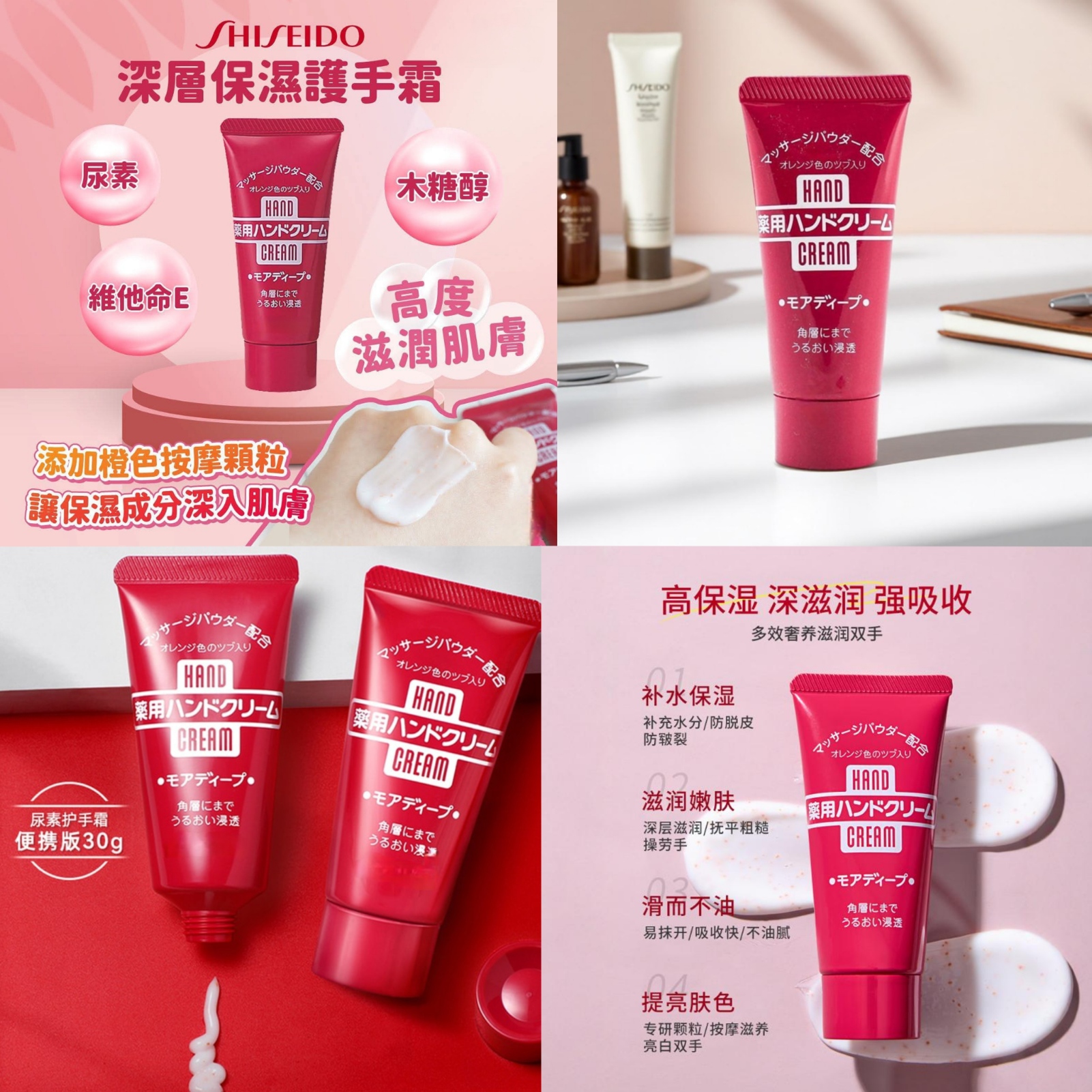 日本手霜界的代表——尿素護手霜🔥。來自日本高級美妝血統的「美肌 護手霜」。以美容級新成分與新概念。誘導出雙手肌膚前所未有的美麗新觸感。含有尿素、維他命E、木糖醇等基礎保濕成分。特別添加按摩微粒子,可經由按摩動作與顆粒輔助,將所有滋養確實帶入肌膚,加速滋潤深層滲透🔝,使肌膚有效吸收。表層不黏膩,不同於一般滋潤型商品的使用感受,即使夏天使用也很適合。同時針對手部肌膚粗糙也具有效果😌。